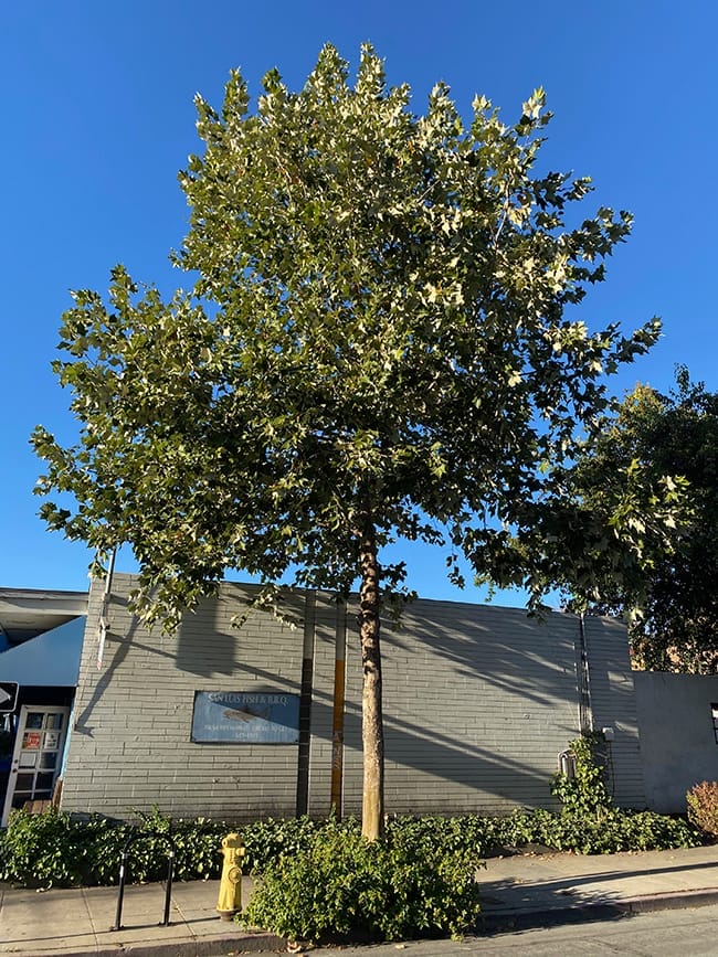 Defining Characteristic: Leaves palmate with prolific brown or mostly green achene fruiting in Fall or Summer. Striking to exfoliating cream or light green bark.